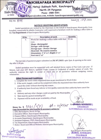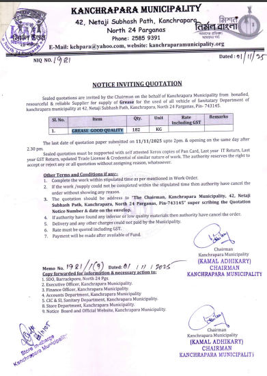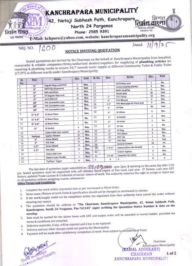 Sealed quotations are invited by the Chairman on behalf of the Kanchrapara Municipality through copy