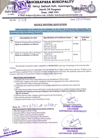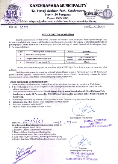 Sealed quotations are invited by the Chairman on the behalf of Kanchrapara Municipality from reputed