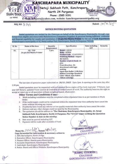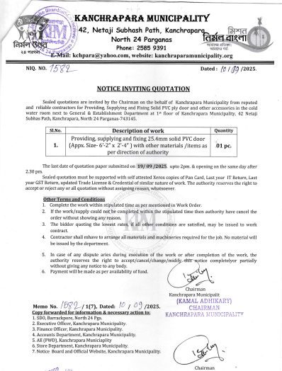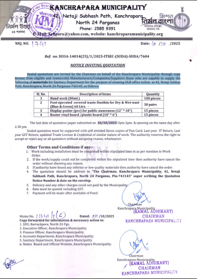 Sealed quotations are invited by the Chairman on the behalf of Kanchrapara Municipality from reputed