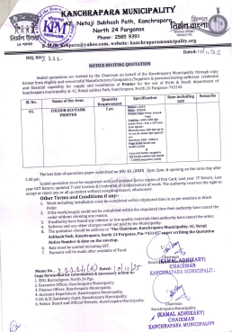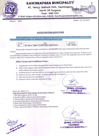 Sealed quotations are invited by the Chairman on behalf of the Kanchrapara Municipality through copy